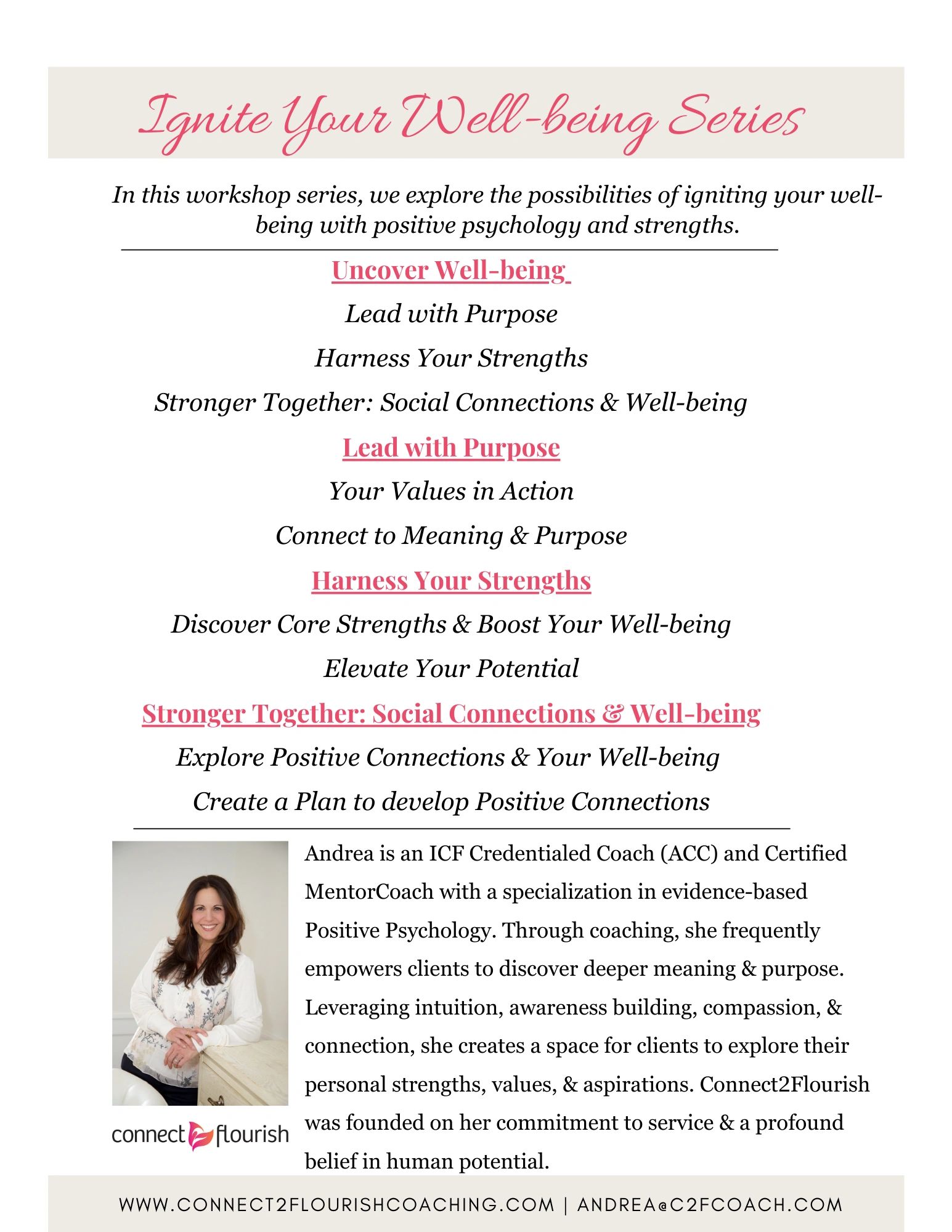 Review of your VIA character strengths assessment and one to three conversations leveraging the science of positive psychology and focusing on your strengths.